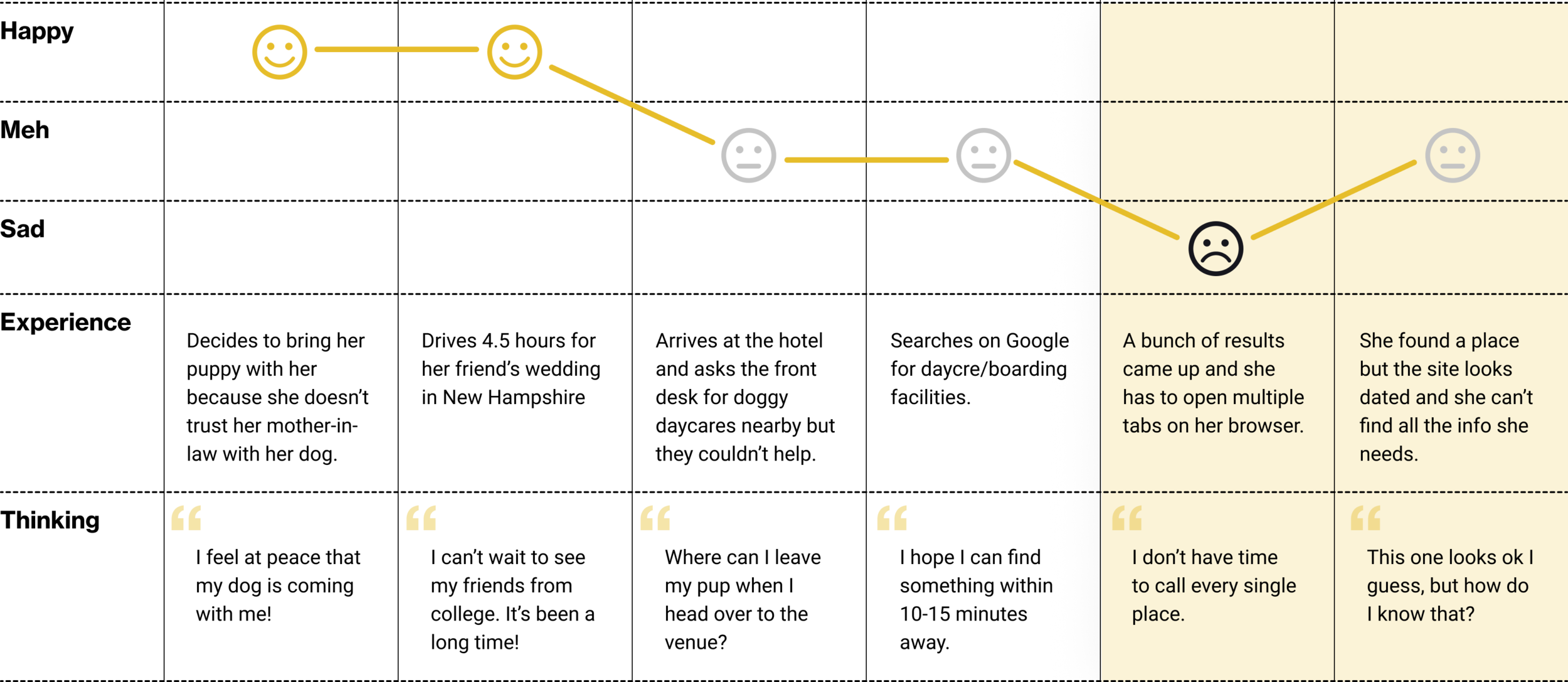 I developed a journey map to understand and track Renée’s needs and pain points. I’ve highlighted the main problems that I would like to address as I developed my design solutions. In the lowest point of her journey, she is overwhelmed by the search results and displeased because she did not have time to call every place.
