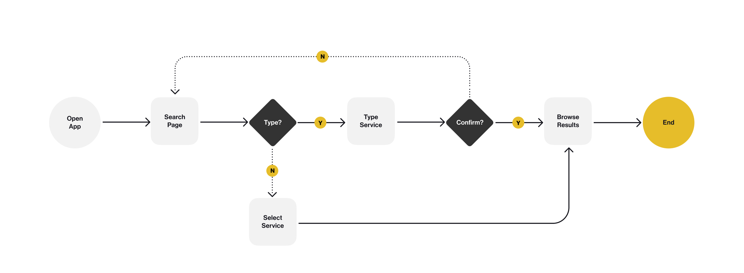When it came to the design stage, I explored 3 potential userflows—search, filter by and create a profile userflows. I focused on the most important one which is the Search. To gain some inspiration, I looked at existing search engine apps, including the ones that were mentioned during the interviews.