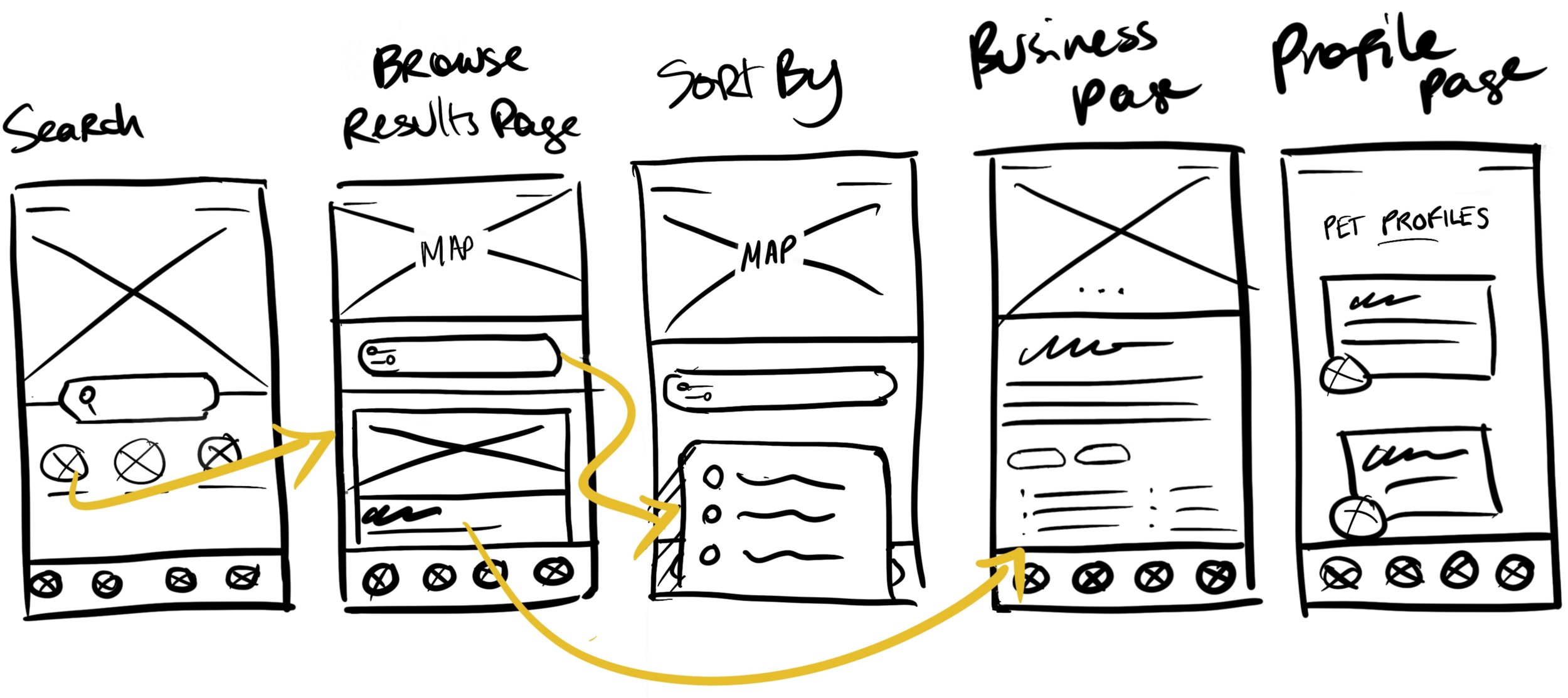 I sketched out a few concepts for the app and took inspiration from the most commonly used search engines. Since being able to search instantly was a prioritized feature for this app, it starts as the home screen. If the user prefers not to type in the search, they can also tap the quick searches that brings them to the results page where they can further sort by location, distance, reviews etc. The business page will include all the important information such as the company website, phone number & location at first glance. I also sketched out a pet profiles page where the user can save favorite pet care services for each individual pet.